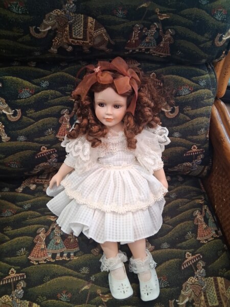 Beautiful Red curly hair 16 ” Collectible Porcelain doll in Victorian period clothing with stand